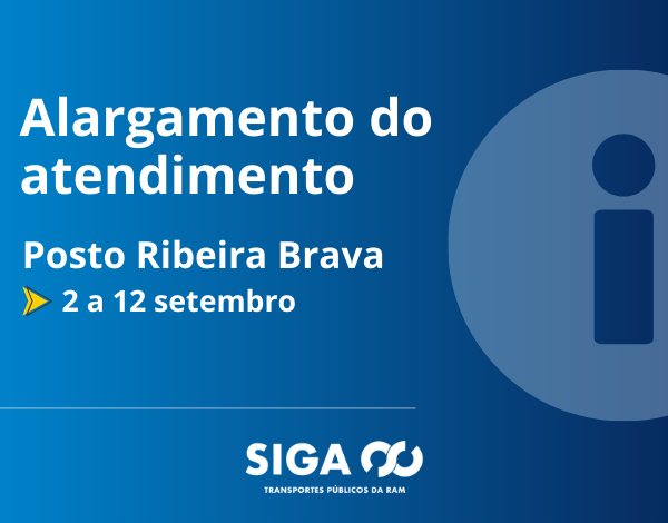 Informamos que o posto de atendimento da Siga Rodoeste na vila da Ribeira Brava estará aberto entre as 8:30-13:00 e entre as 15:00 e as 18:00, do dia 2 de setembro até 12 de setembro (exceto sábado e domingo). Desta forma, os estudantes podem revalidar aí o seu Passe Social 4_23 para o ano letivo 2025/2026 em alternativa à Rua do Esmeraldo, 50-52, Funchal.