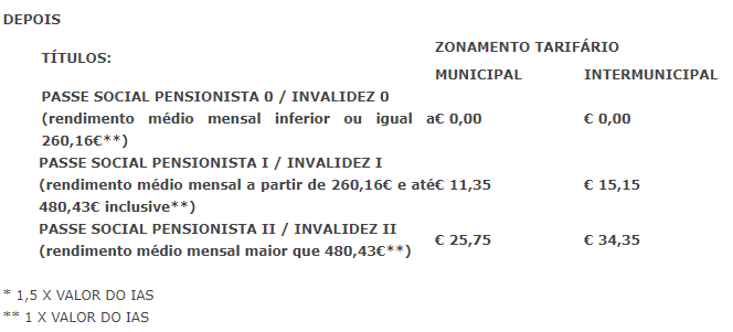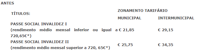 Para os detentores de estatuto de invalidez que tenham um rendimento entre os 260,16 euros e os 480,43 euros, o passe municipal passa a custar 11,35 euros e o intermunicipal 15,15 euros. Para o terceiro grupo, com rendimentos médios superiores a 480,43 euros, o custo do passe municipal será de 25,75 euros e o intermunicipal será de 34,35 euros.
